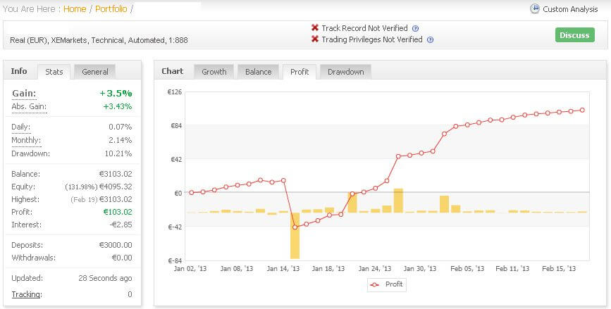 In tre mesi (il conto è stato aperto il 29 ottobre ma ha cominciato a funzionare dalla metà di novembre per una serie di errori in fase di apertura della VPS) sono in guadagno quasi del 36%, quindi un 12% mensile.