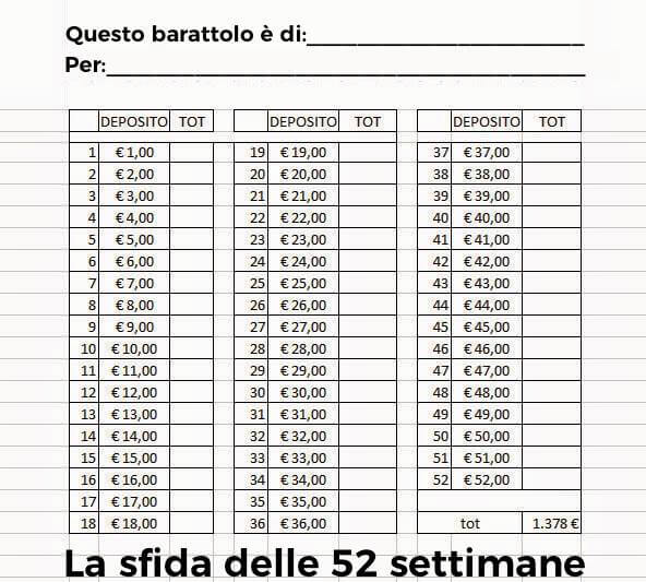 Questa sfida è nota sul web come 52 Weeks Money Challenge. Te la propongo nella sua versione originale e con qualche suggerimento pratico che ritengo utile per portarla a termine più facilmente.